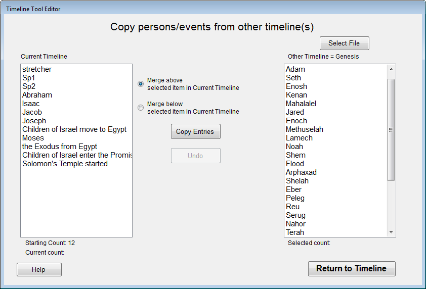 Each timeline is saved as an individual file. In a timeline you will enter individual timeline entries (e.g. Peleg, Reu, Serug, etc).